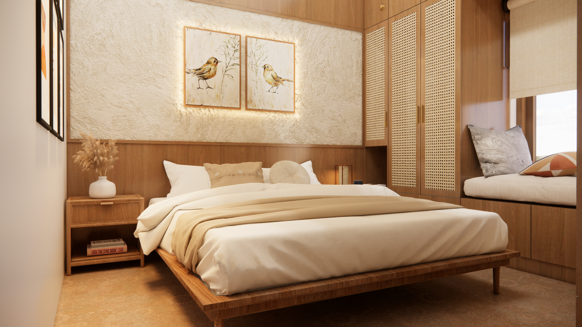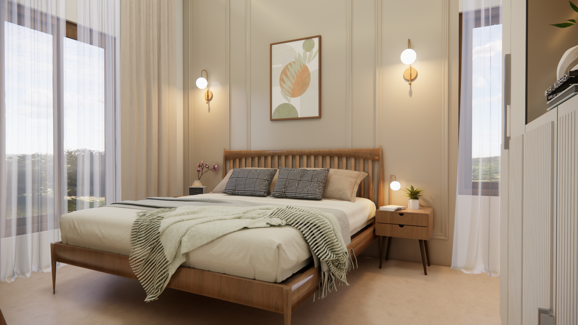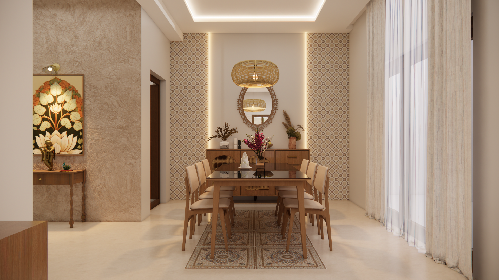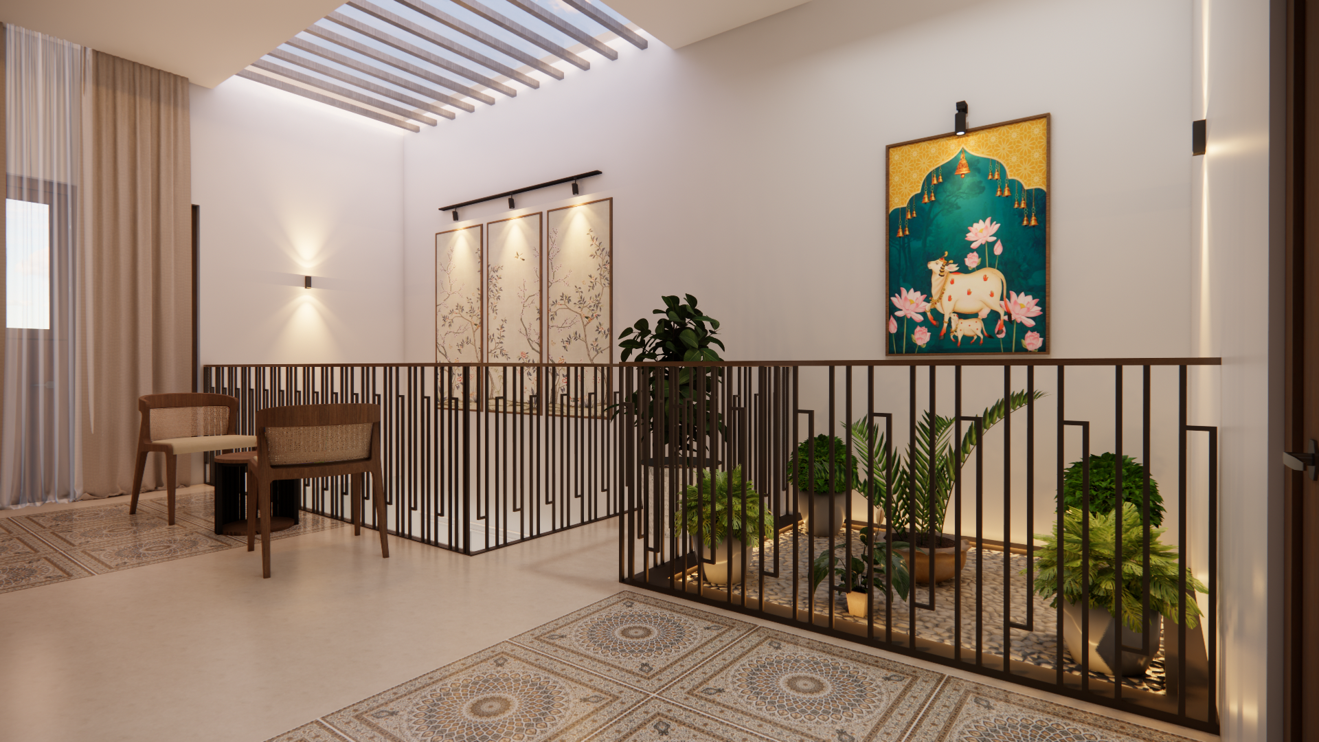 The spacious living area features an atrium, bringing in ample natural light and creating a sense of openness. The Pooja room which is located at the centre of the house not only serves as a spiritual space but also acts as a subtle division between the living and dining areas, reflecting cultural values and traditions. A room on the ground floor includes a private sit-out, offering a cozy retreat for relaxation and contemplation.