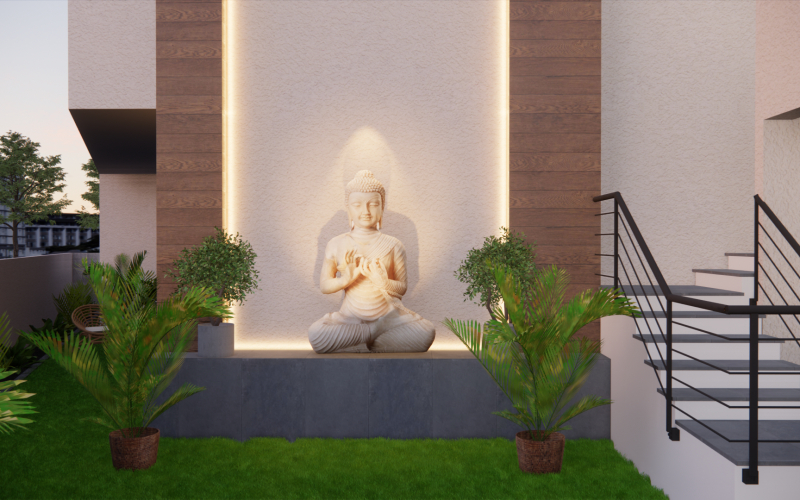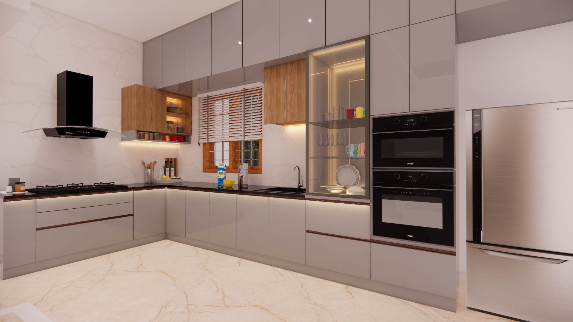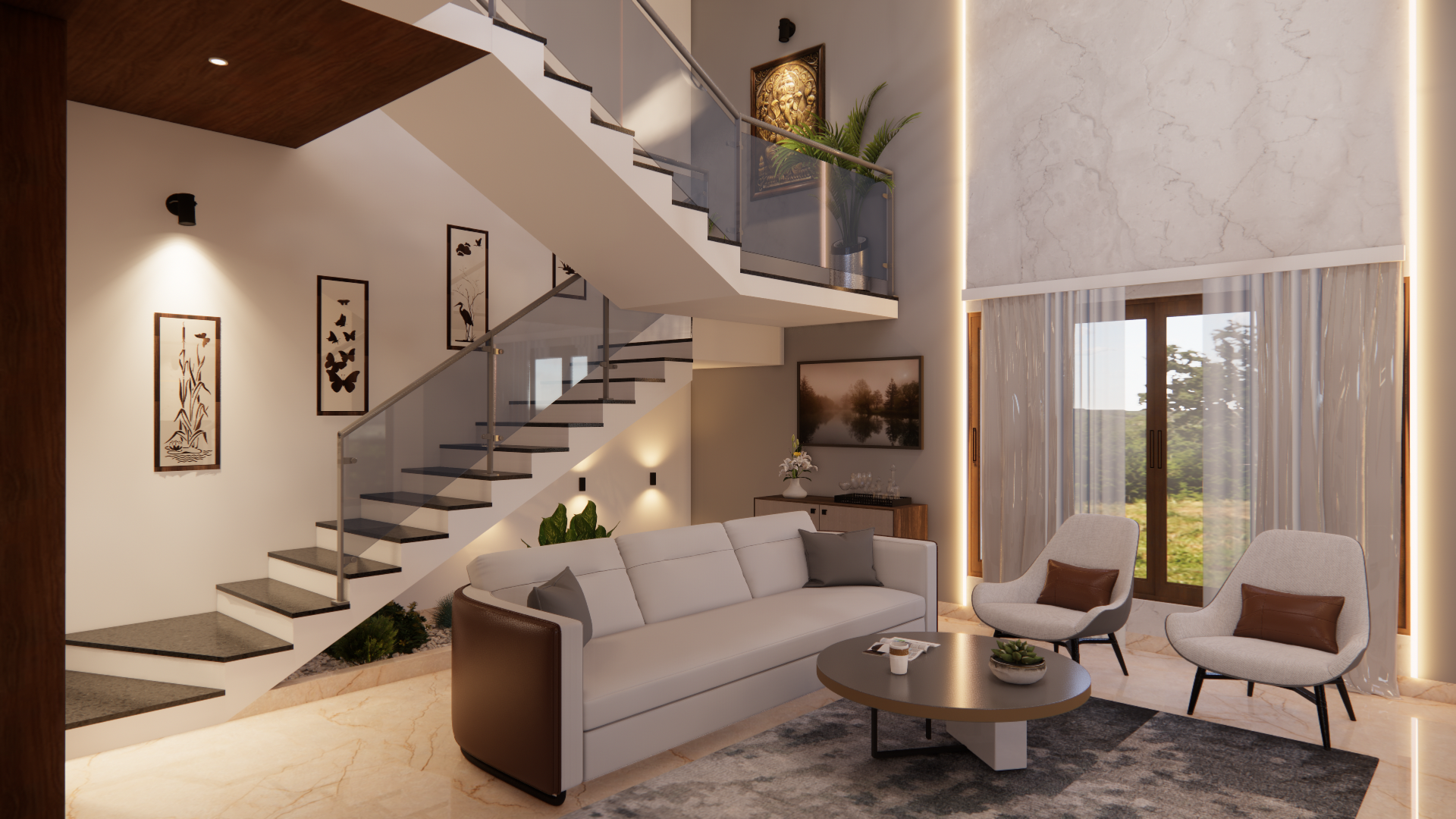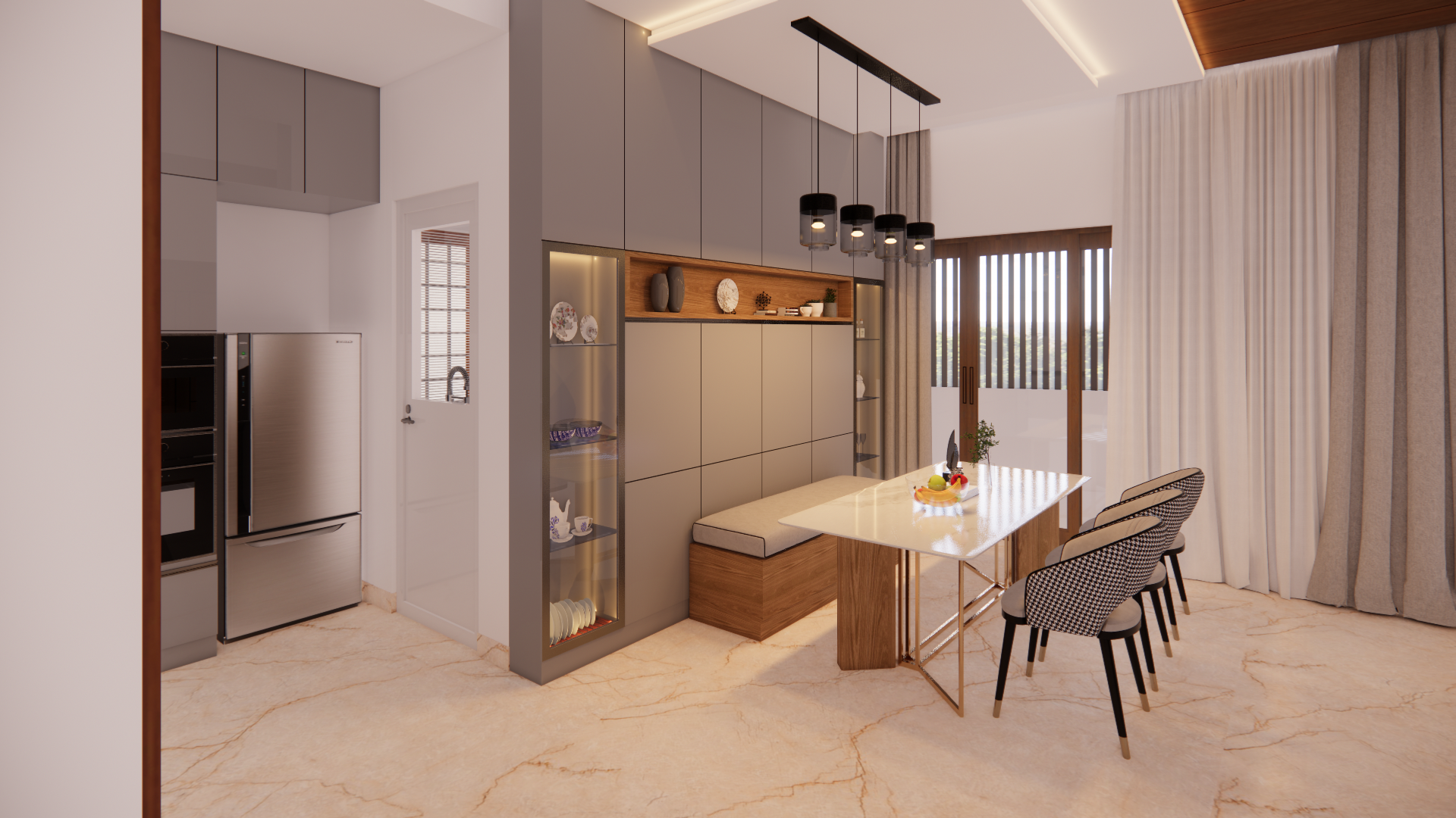 TThe staircase garden, open to the skylight above, infuses the interior with natural light and a serene ambiance, complemented by a tranquil water fountain featuring a Kamadhenu idol in the dining area. The kitchen, styled with acrylic finishes and rafter detailing, seamlessly connects to the dining space, enhancing both aesthetic appeal and practicality.