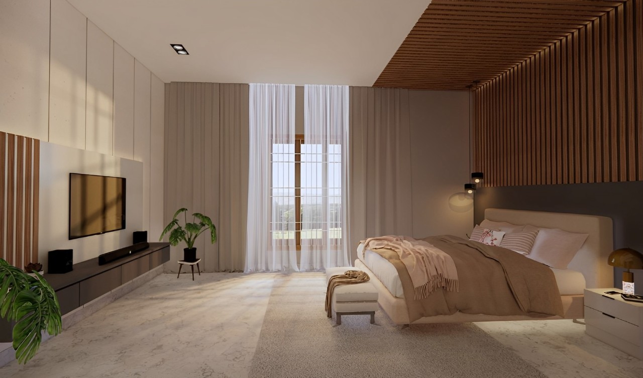 Moving to the first floor, the family area enjoys visual connectivity with the main entrance, facilitating easy movement and a sense of openness. The first-floor master bedroom impresses with lavish dimensions, including a generous walk-in area and a private balcony that overlooks both the road and the garden, providing a peaceful retreat.