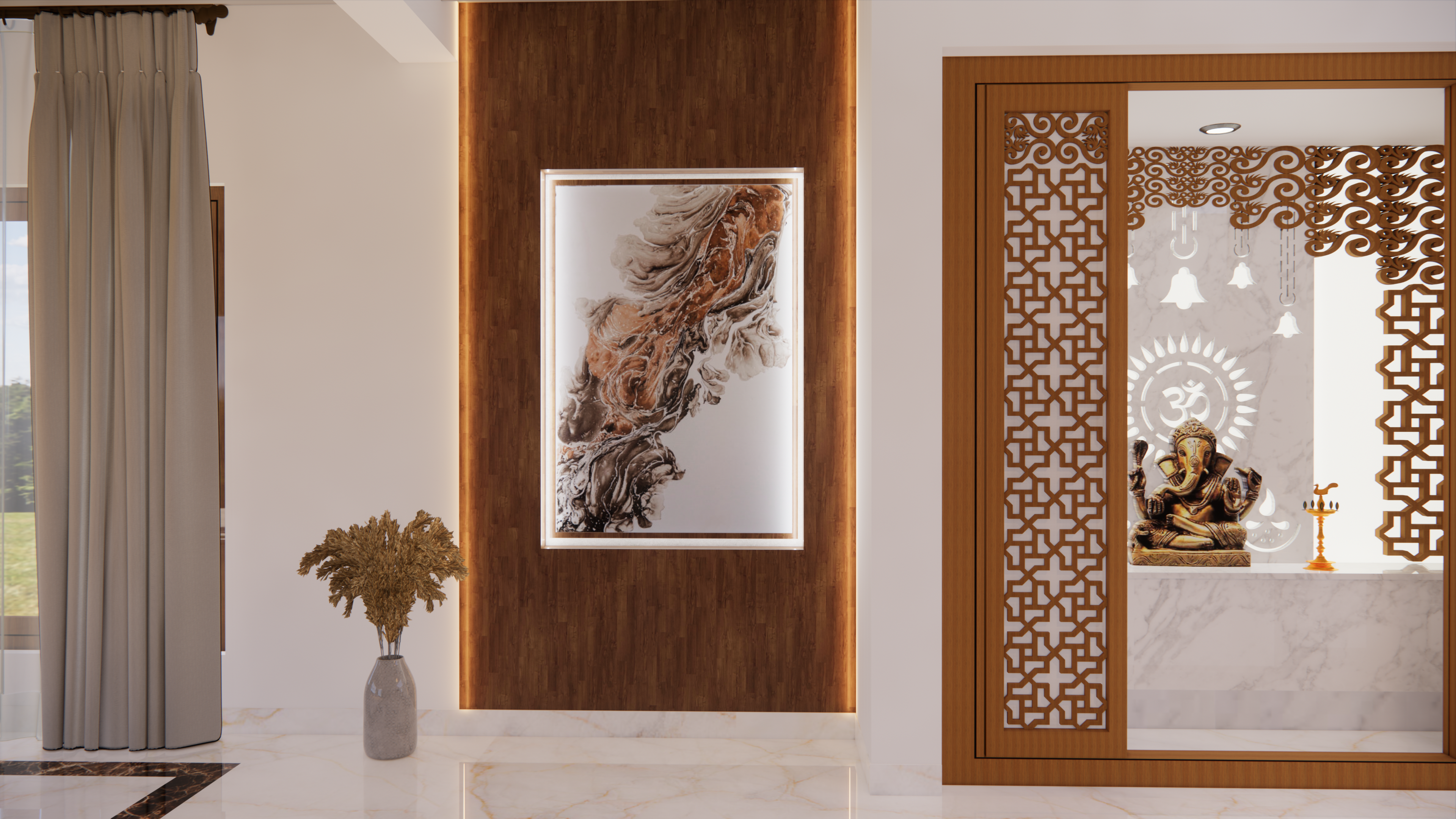 Soft pastel colors throughout the interior add a serene and welcoming ambiance, complemented by a staircase surrounding a Pooja room, which serves as a focal point and an attractive element of cultural reverence.