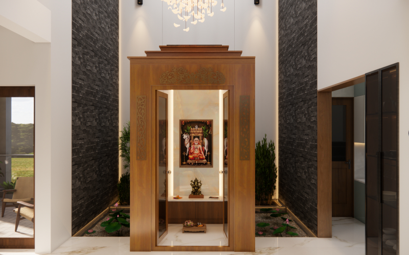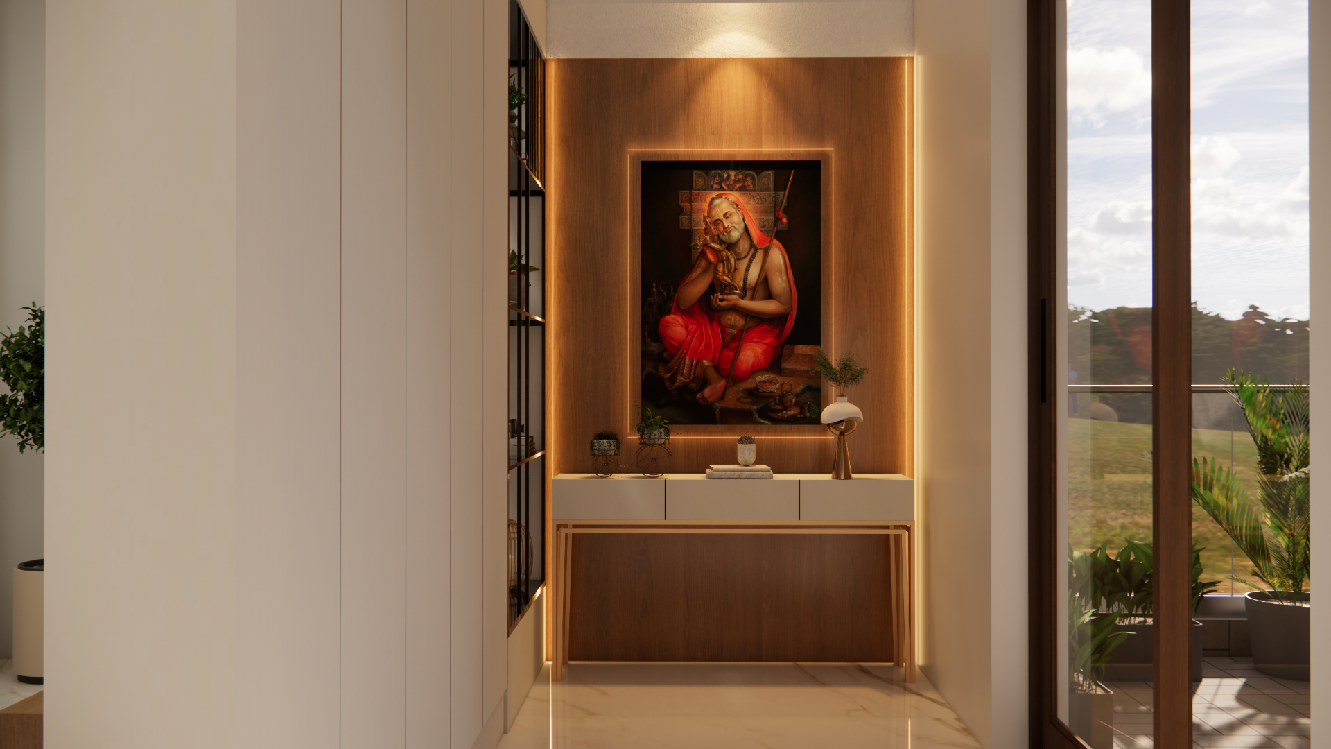 Larger bedroom with ample space for a closet and a private balcony, enhancing comfort and privacy for the occupants. Along with peaceful common balcony on the First floors features a waterbody and a Krishna idol in Garden zone, creating a serene and contemplative space.