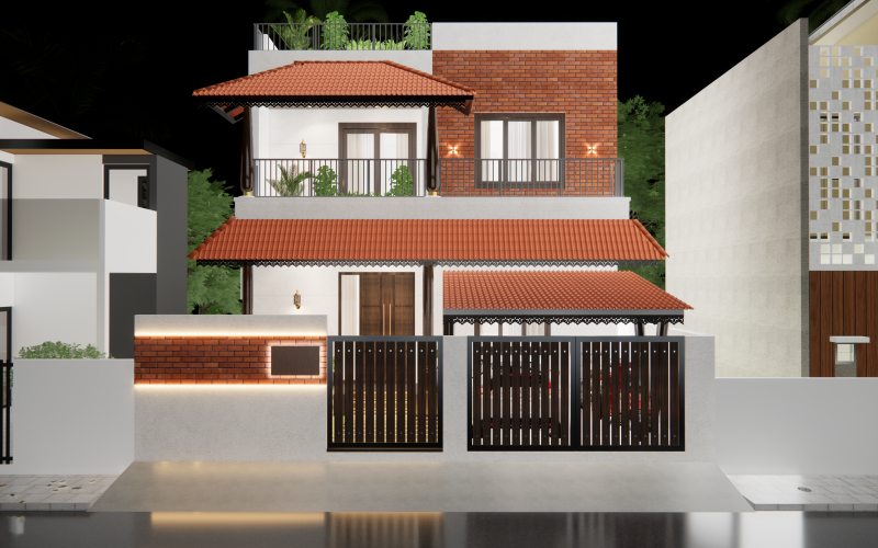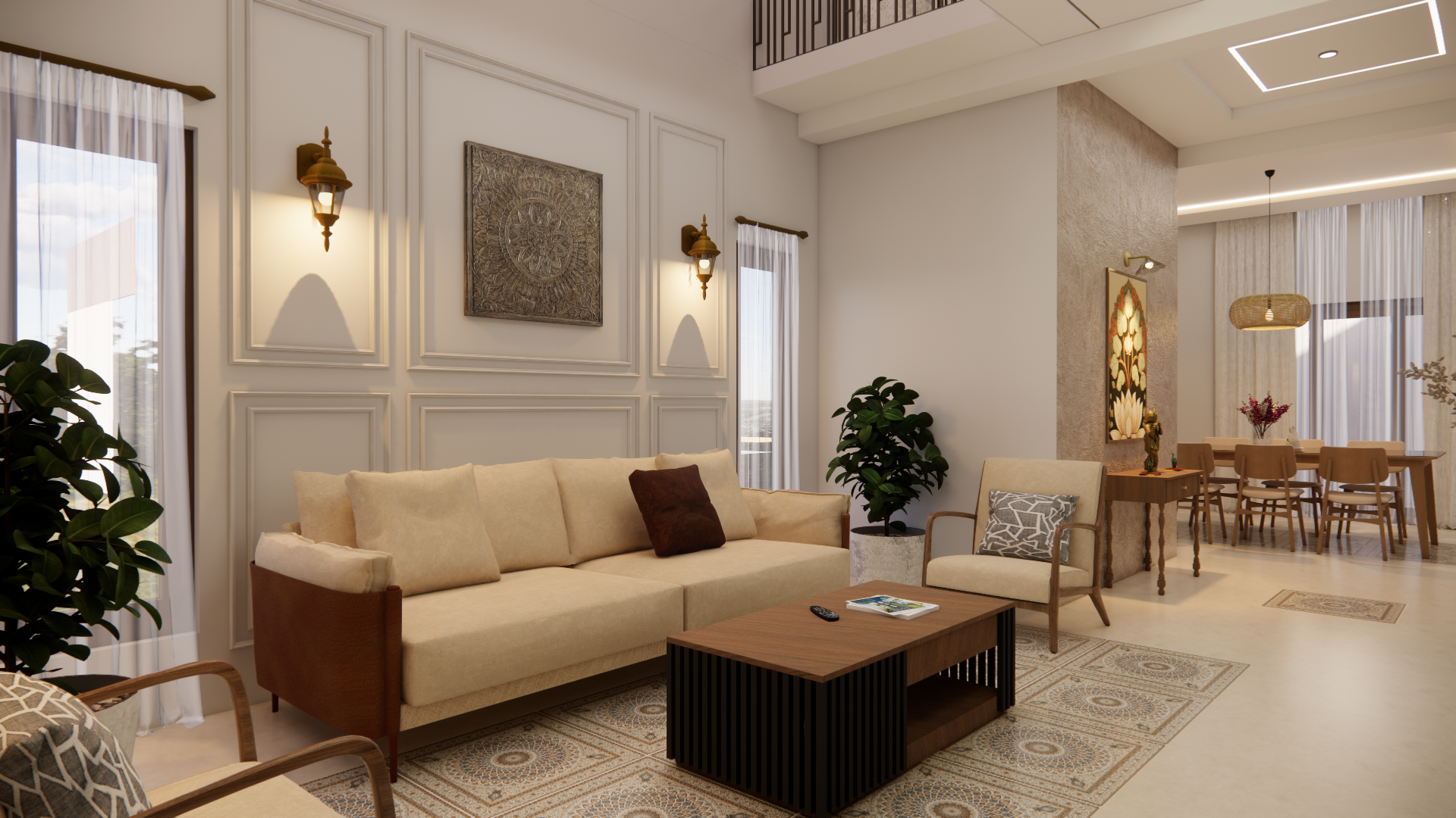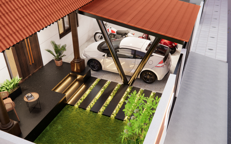 The spacious living area features an atrium, bringing in ample natural light and creating a sense of openness. The Pooja room which is located at the centre of the house not only serves as a spiritual space but also acts as a subtle division between the living and dining areas, reflecting cultural values and traditions. A room on the ground floor includes a private sit-out, offering a cozy retreat for relaxation and contemplation.